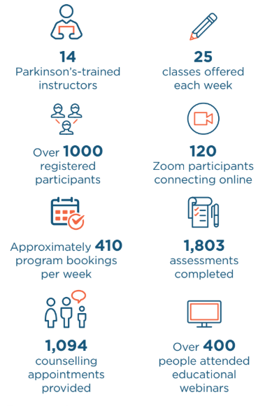 Looking back on the past year, it’s inspiring to see how the PWP community continues to grow and thrive. Thanks to the generosity of donors, volunteers, and supporters, Parkinson Wellness Projects remained a welcoming, barrier-free space where people living with Parkinson’s and their care partners could access support, connection, and evidence-based programs. In 2025, our programs reached more people than ever before, building strength, confidence, and community. Here’s a snapshot of what your support made possible in 2025: